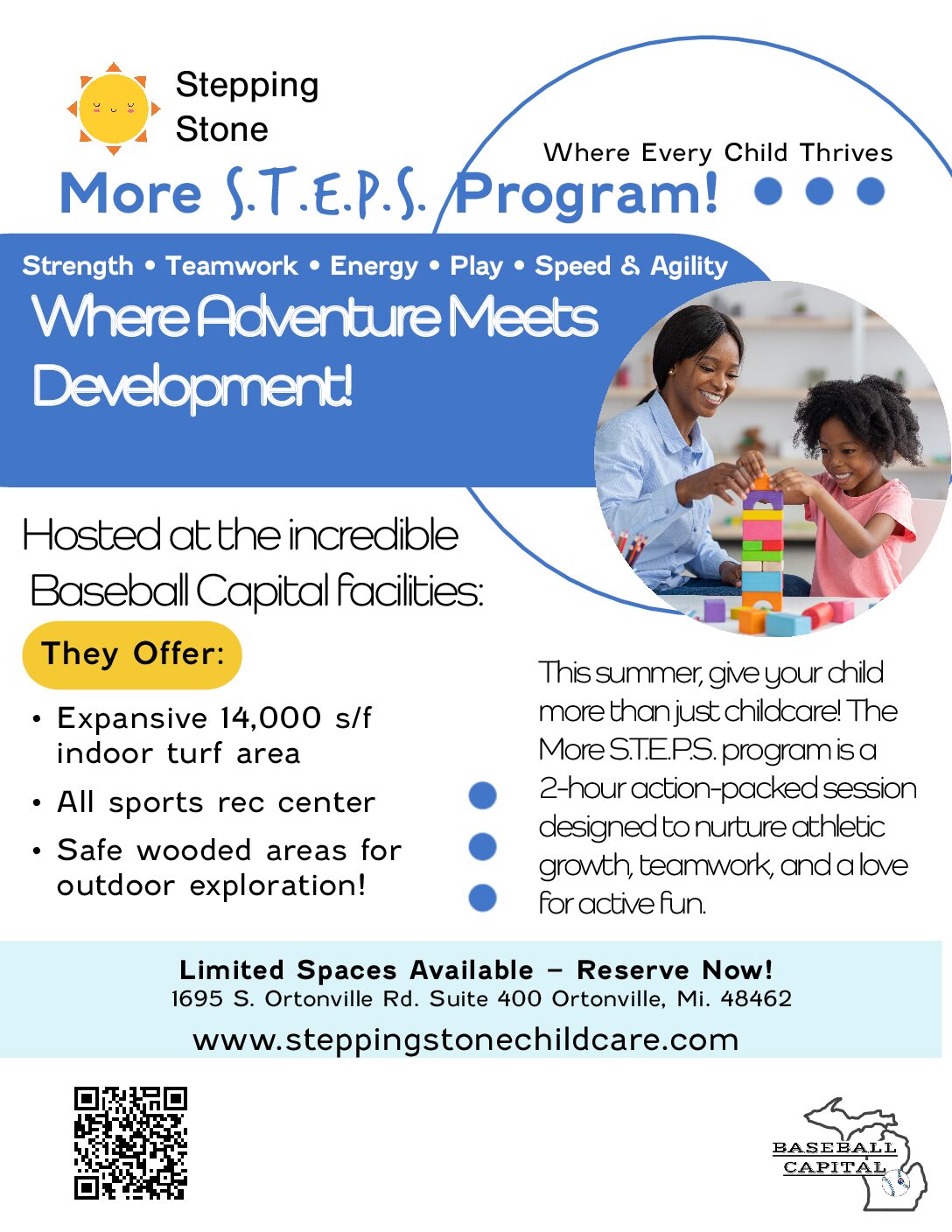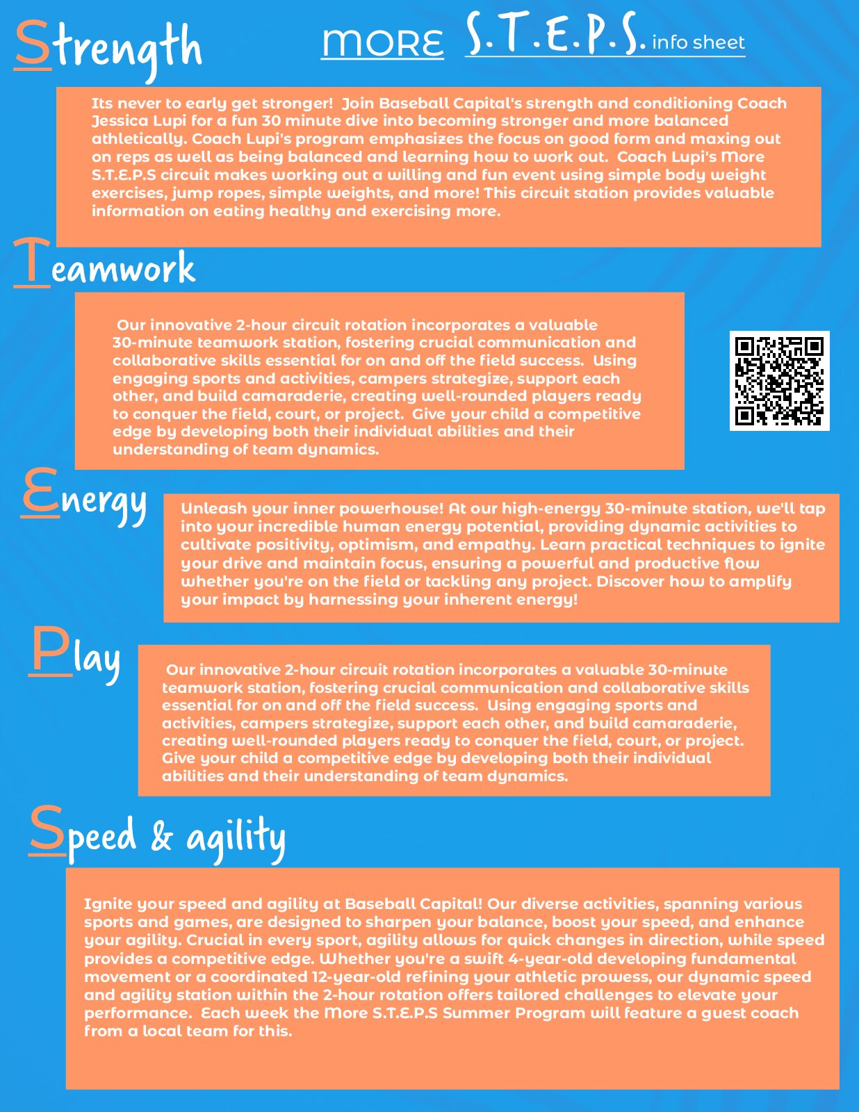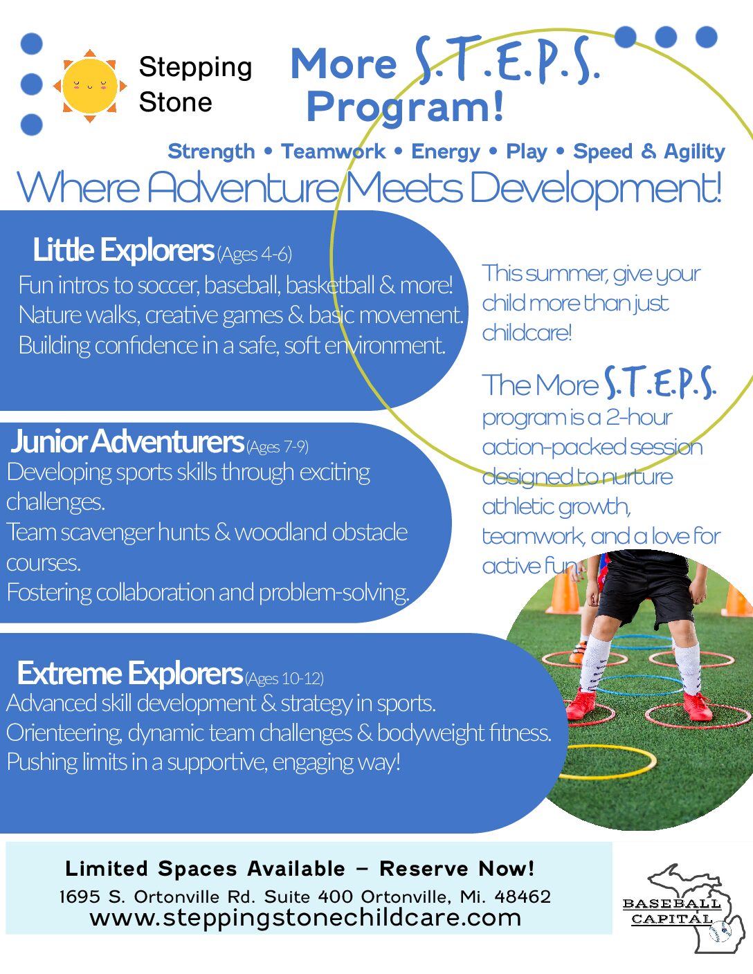 The More S.T.E.P.S. program is a 2-hour action-packed session designed to nurture athletic growth, teamwork, and a love for active fun.